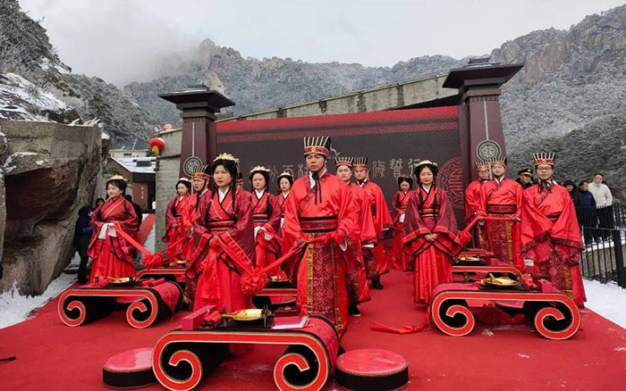 ????活動(dòng)當(dāng)日,在銀裝素裹的煉丹湖畔,一場(chǎng)典雅精致的“執(zhí)子之手 緣圓天柱”中式集體婚禮正式開始,笙簫鼓樂齊奏祥瑞之聲,十對(duì)新人攜手走過幸福大道,“新人火上過,日子過紅火”“新人邁馬鞍,步步保平安” ……在一聲聲喜慶吉祥的祝福聲里,新人們跨過火盆、馬鞍,步入典禮現(xiàn)場(chǎng)。潛山市委常委、天柱山管委會(huì)副主任舒寒冰為新人致主婚詞,見證和祝福十對(duì)新人締結(jié)良緣。